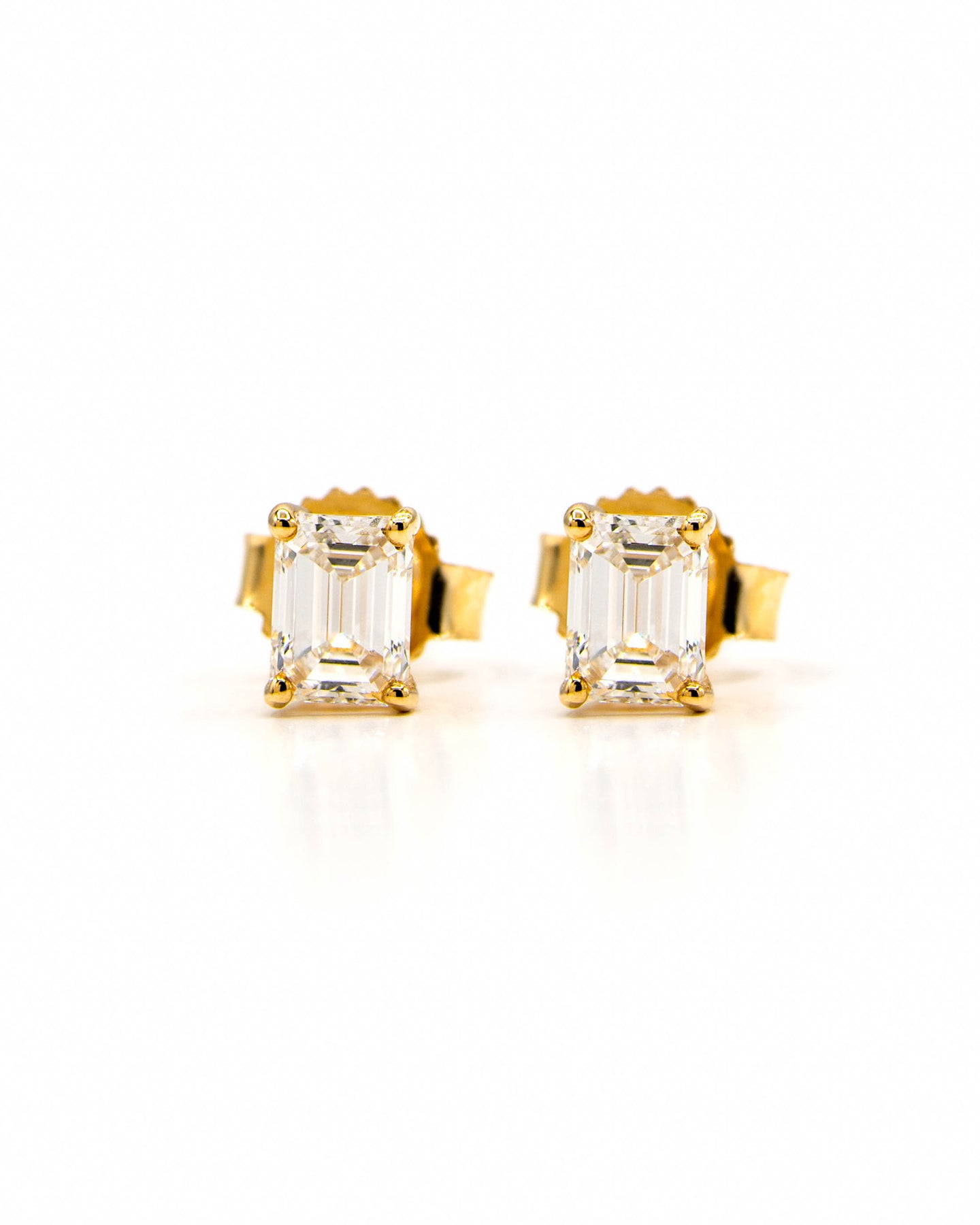 Emerald shape diamonds meticulously set in a 14 karat gold 4-prong setting, featuring push-backs with a double notched post for increased security.