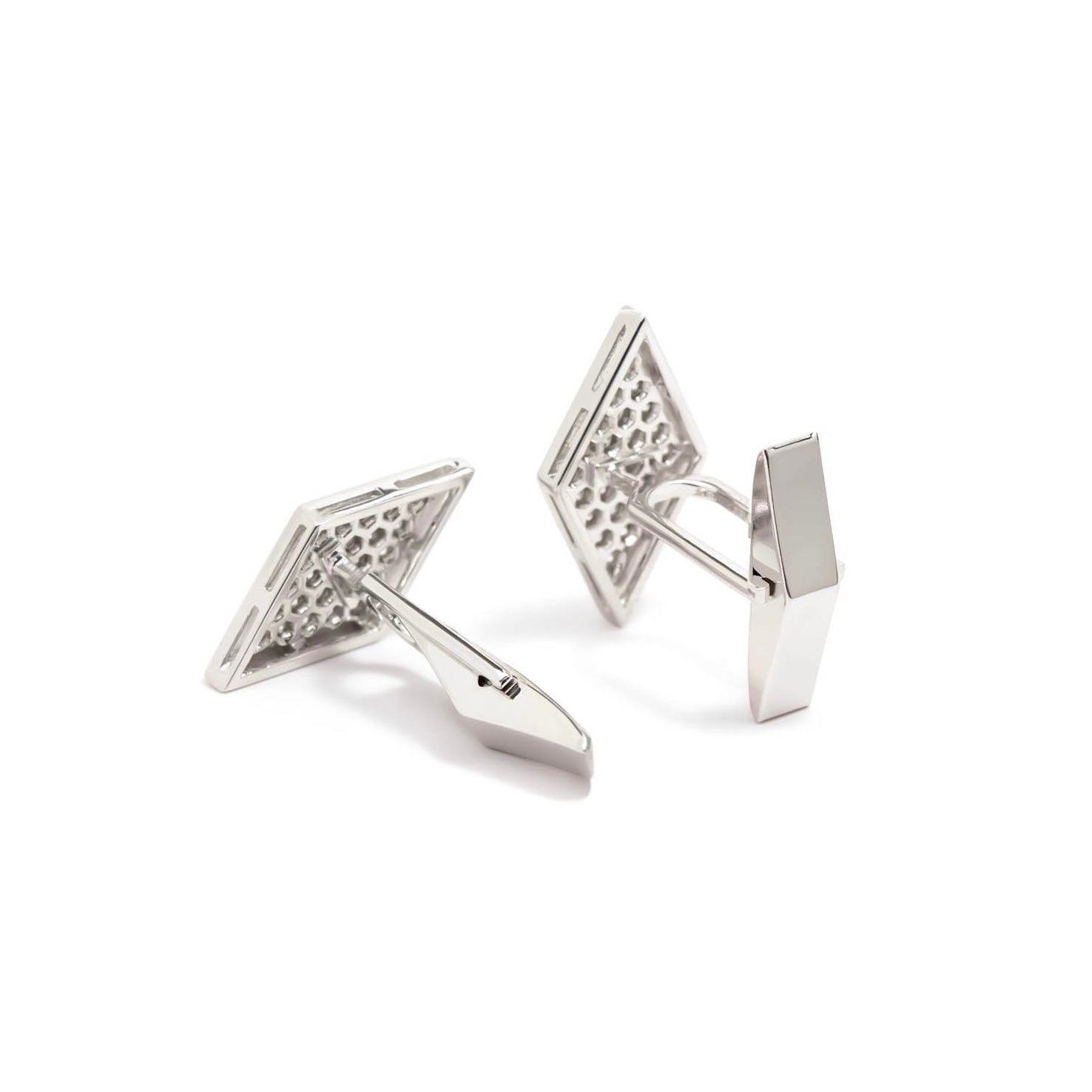 These classic diamond-shaped cufflinks feature white diamonds set in 14k white gold.
