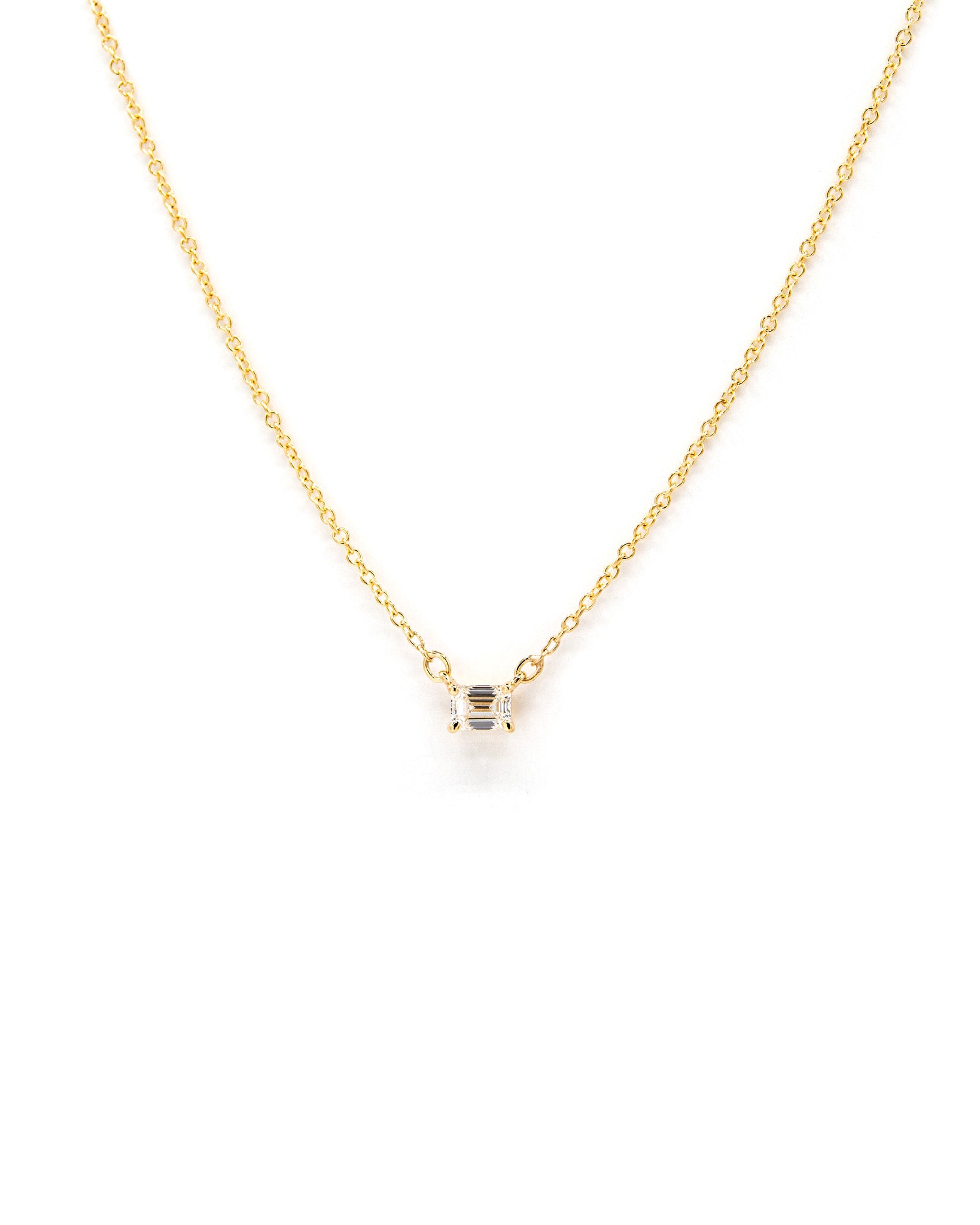 Add a sparkle of shine to your everyday look. This emerald shape diamond 4-prong pendant set in your choice of 14k white or yellow gold is adjustable from 14 to 16 inches, enclosed by a lobster clasp. Its dainty style makes it perfect for everyday wear.